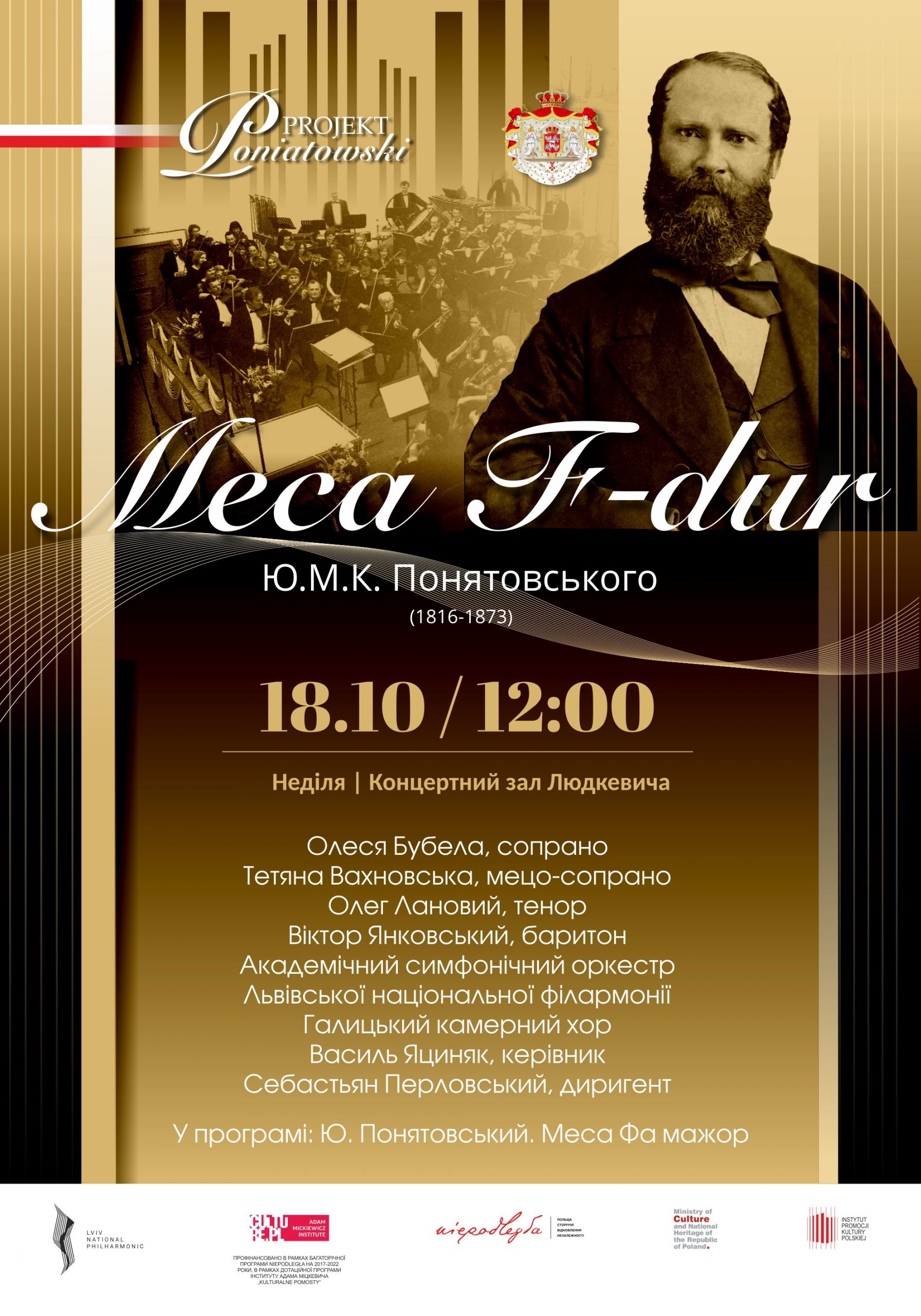 Zapraszamy na Koncert Mszy F-dur księcia J.M.K.Poniatowskiego we Lwowie. Dofinansowano w ramach Programu Wieloletniego NIEPODLEGŁA na lata 2017-2022, w ramach programu dotacyjnego Instytutu Adama Mickiewicza „Kulturalne pomosty”